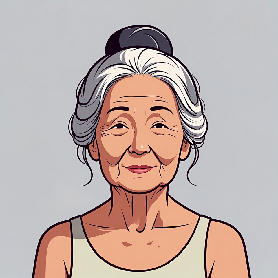 A detailed illustration of an elderly Asian woman with long white hair styled in a black bun on top. She has a gentle smile, fine wrinkles around her eyes and mouth, and wears a light green sleeveless top. The portrait is set against a plain gray background.