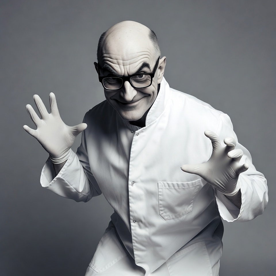 A bald White man with exaggerated facial features wears thick black-rimmed glasses, a white lab coat, and white latex gloves. He stands against a gray background with hands raised dramatically, fingers splayed and grinning widely. His expression is mischievous and intense.