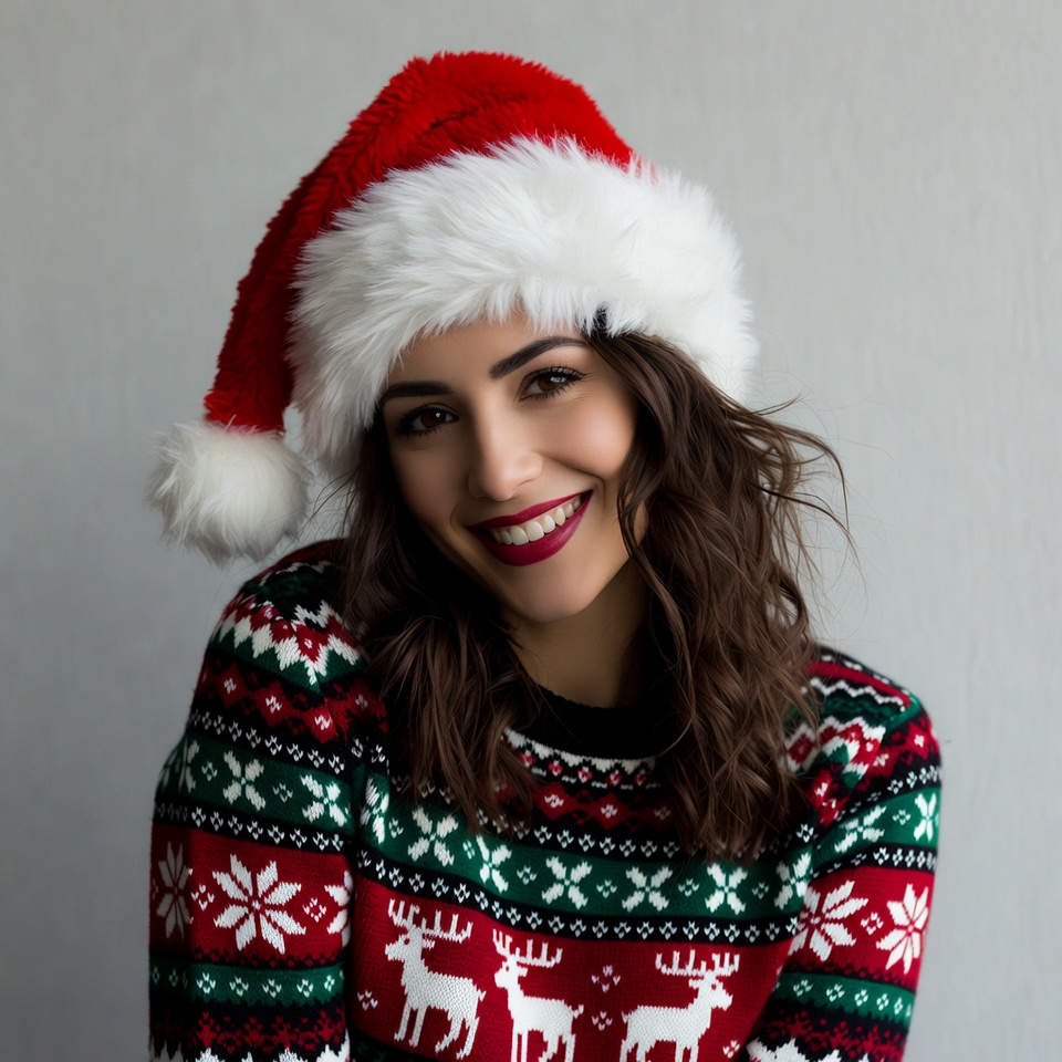 Christmas, Christmas sweater, Latino, Santa hat, brown hair, closeup, deer design, female, festive outfit, holiday fashion, joyful, knitted sweater, pom pom, portrait, red hat, reindeer sweater, smiling, snowflakes, sweater pattern, wavy hair, white background, white fur, winter, woman