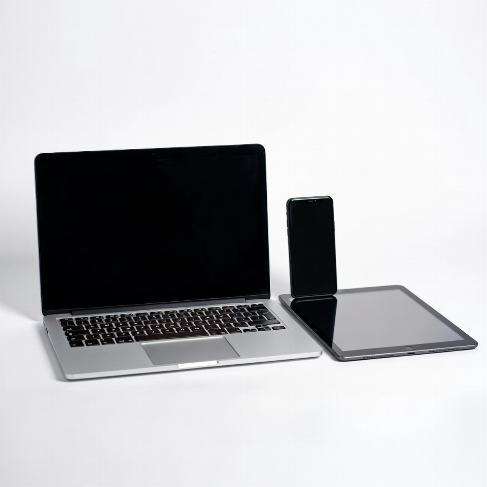 MacBook, black phone, computer, devices, electronics, gadgets, gray tablet, iPad, iPhone, isolated, keyboard, mobile phone, product photography, screen, silver laptop, smartphone, tablet, technology, white background, laptop