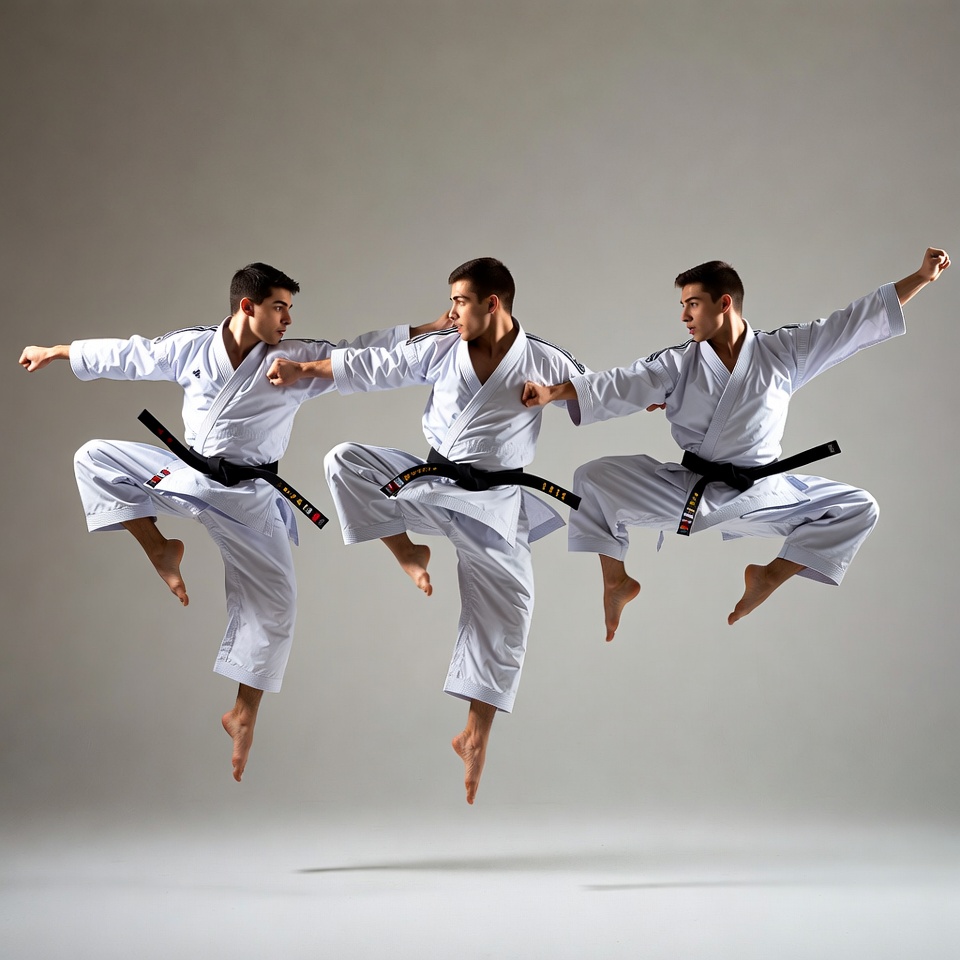 White, action pose, arms out, athletic, bare feet, black belt, dynamic, fighters, gi, gray background, high kick, jumping, kicking, legs extended, male, martial arts, men, mid-air, muscular, short hair, sport, studio shot, three men, training, white uniform, karate