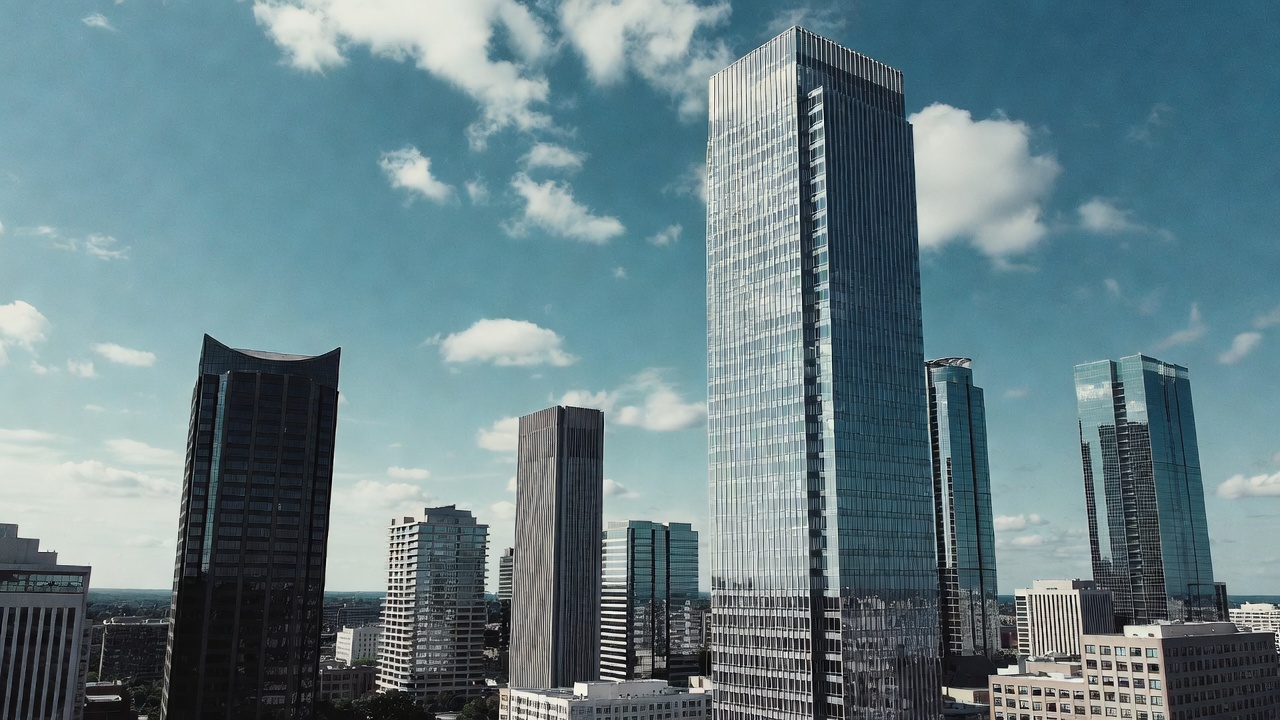 aerial view, architecture, blue sky, cityscape, daytime, downtown, glass towers, high-rise, metropolis, modern buildings, reflections, skyscrapers, tall buildings, urban landscape, white clouds, city skyline