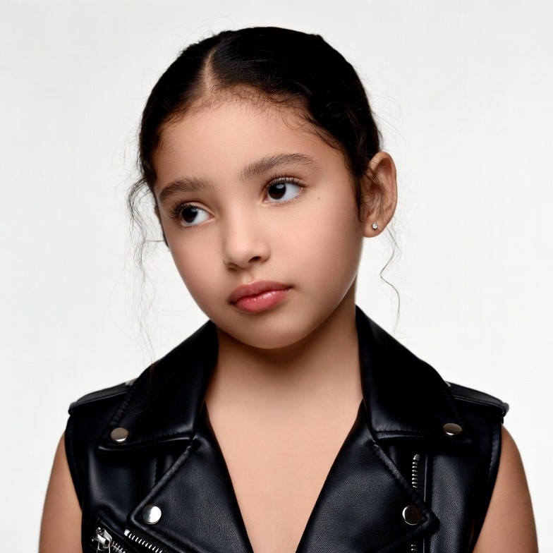 A young Latino girl with dark curly hair tied back gazes slightly to the side against a white background. She wears a black leather vest jacket with silver zippers and studs, and small stud earrings. Her expression is neutral with pink lips.