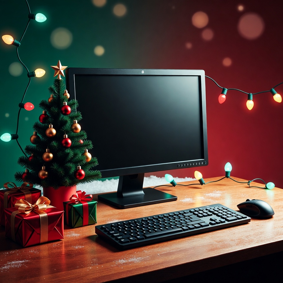 A wooden desk features a black computer monitor with a blank screen, flanked by a small decorated Christmas tree with gold ornaments. Colorful string lights in green and red hang around the setup, with wrapped gift boxes and a red pot nearby. Snowflakes and bokeh lights add a festive holiday atmosphere on a green and red blurred background.