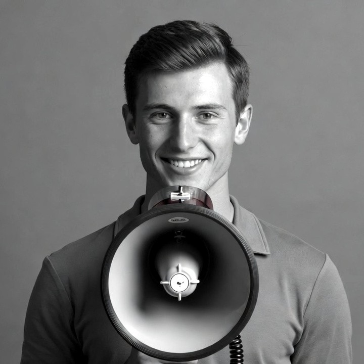 A young man with short dark hair smiles while holding a large black megaphone in front of his face. He wears a collared shirt and stands against a plain gray background. The image is in black and white.