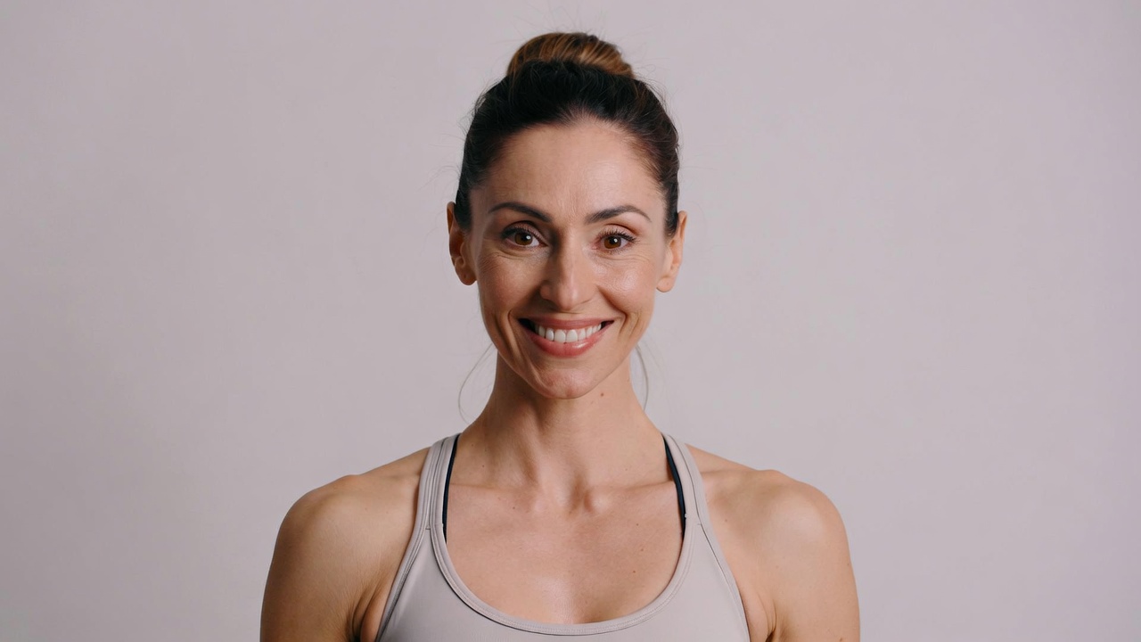 A woman with brown hair in a bun smiles warmly at the camera against a plain light gray background. She wears a gray sleeveless tank top that reveals her shoulders and collarbone. Her expression is friendly and engaging.