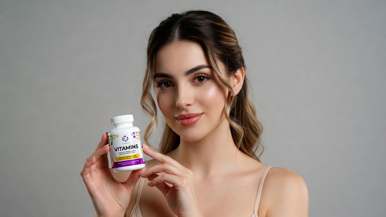 A young woman with long wavy brown hair holds a white vitamin supplement bottle with purple and yellow labels. She has a subtle smile, wears a light-colored off-shoulder top, and stands against a plain gray background. Her fingers gently grip the bottle in front of her chest.
