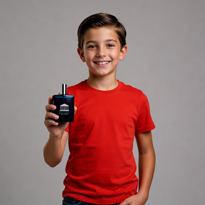 Parthenon logo, White, blue bottle, brown hair, child model, cologne bottle, fragrance, gray background, happy child, holding perfume, isolated background, jeans, male, red t-shirt, short hair, smiling boy, young boy, boy