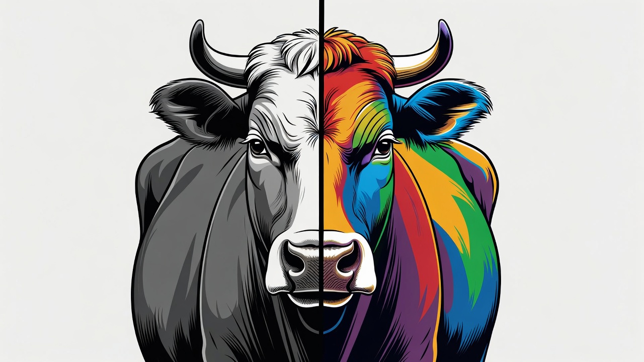A bull's face is split in half with the left side in black and white and the right side in vibrant rainbow colors. It features prominent horns, detailed eyes, and a serious expression. The illustration is set against a plain white background.