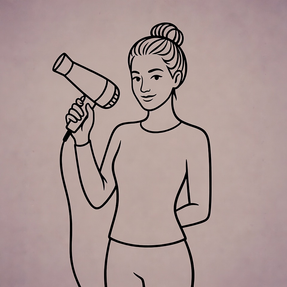 A line art illustration depicts an Asian woman with her hair in a bun holding a handheld hair dryer. She wears a long-sleeved top and pants, standing against a plain light purple background. The image is presented in a simple black outline style.