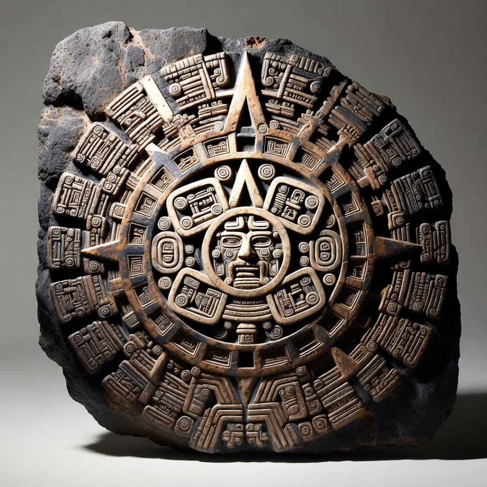Aztec calendar, Aztec symbol, Mesoamerican art, Mexican history, Sun Stone, Tonatiuh face, ancient carving, archaeological artifact, black rock, carved rock, circular carving, cultural artifact, detailed engraving, glyphs, historical relic, indigenous art, stone face, stone relief, stone sculpture, sun god, textured stone, Aztec Sun Stone