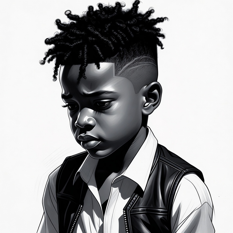 African-American, afro, black white, child, collared shirt, curly hair, detailed drawing, digital illustration, fashion, groomed hair, hairstyle, illustration, kid, leather vest, male, portrait, pouting lips, realistic art, serious expression, side profile, streetwear, undercut, white shirt, young boy, boy