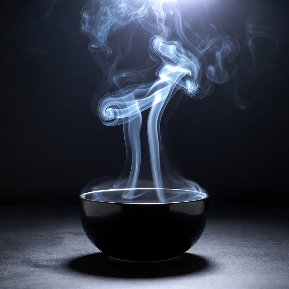 A black bowl sits on a dark surface with white steam rising dramatically from it. The steam swirls and curls upward in intricate patterns against a black backdrop. Soft lighting highlights the bowl and vapor.