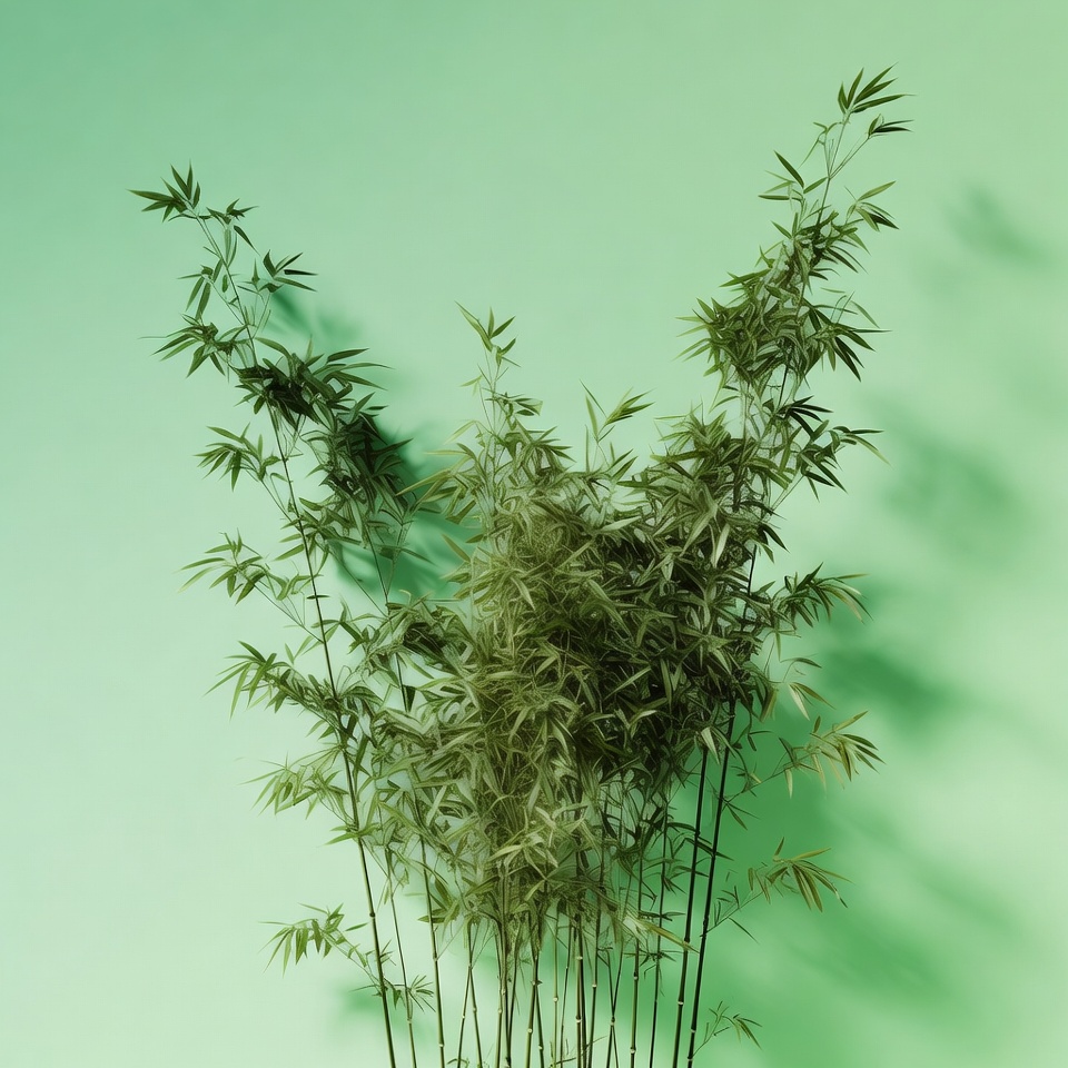 Tall green bamboo stalks with slender leaves stand clustered against a solid mint-green background. Subtle shadows fall across the vibrant foliage, creating depth and contrast. The plant appears fresh and isolated for display.