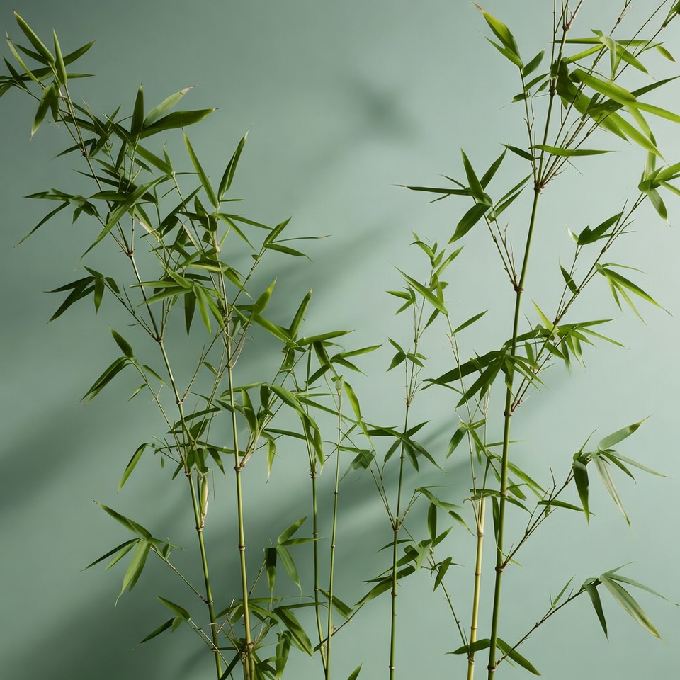 Several tall green bamboo stalks with slender leaves stand against a light mint green wall. Soft shadows from the bamboo create patterns on the wall behind. The plant is isolated on a plain background.