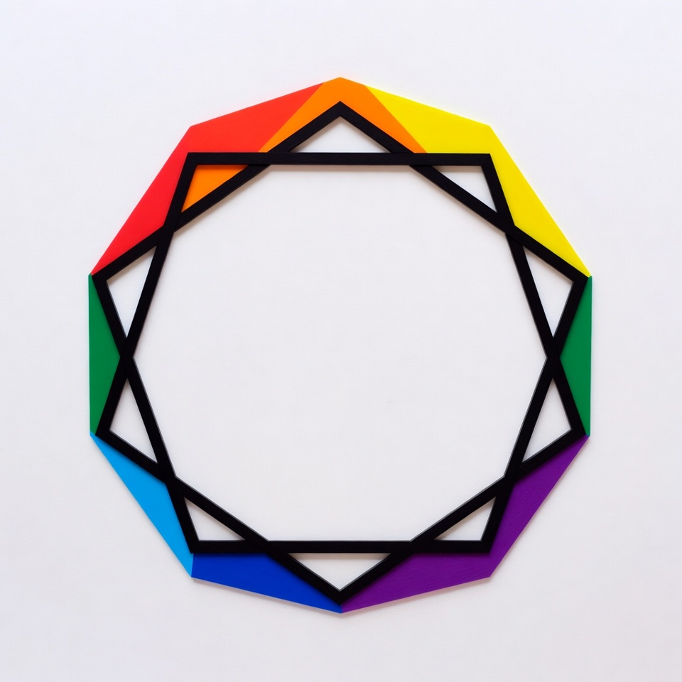 LGBTQ, abstract design, black outline, blue triangle, clipart, colorful outline, geometric shape, green triangle, isolated graphic, octagon, orange triangle, polygon, pride symbol, purple triangle, rainbow colors, red triangle, vibrant colors, white background, yellow triangle, rainbow octagon