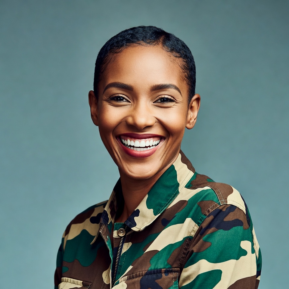 blue background, bright eyes, camo clothing, camouflage jacket, curly hair, female, green jacket, happy face, headshot, joyful expression, portrait, short hair, smiling, white teeth, woman, African-American woman