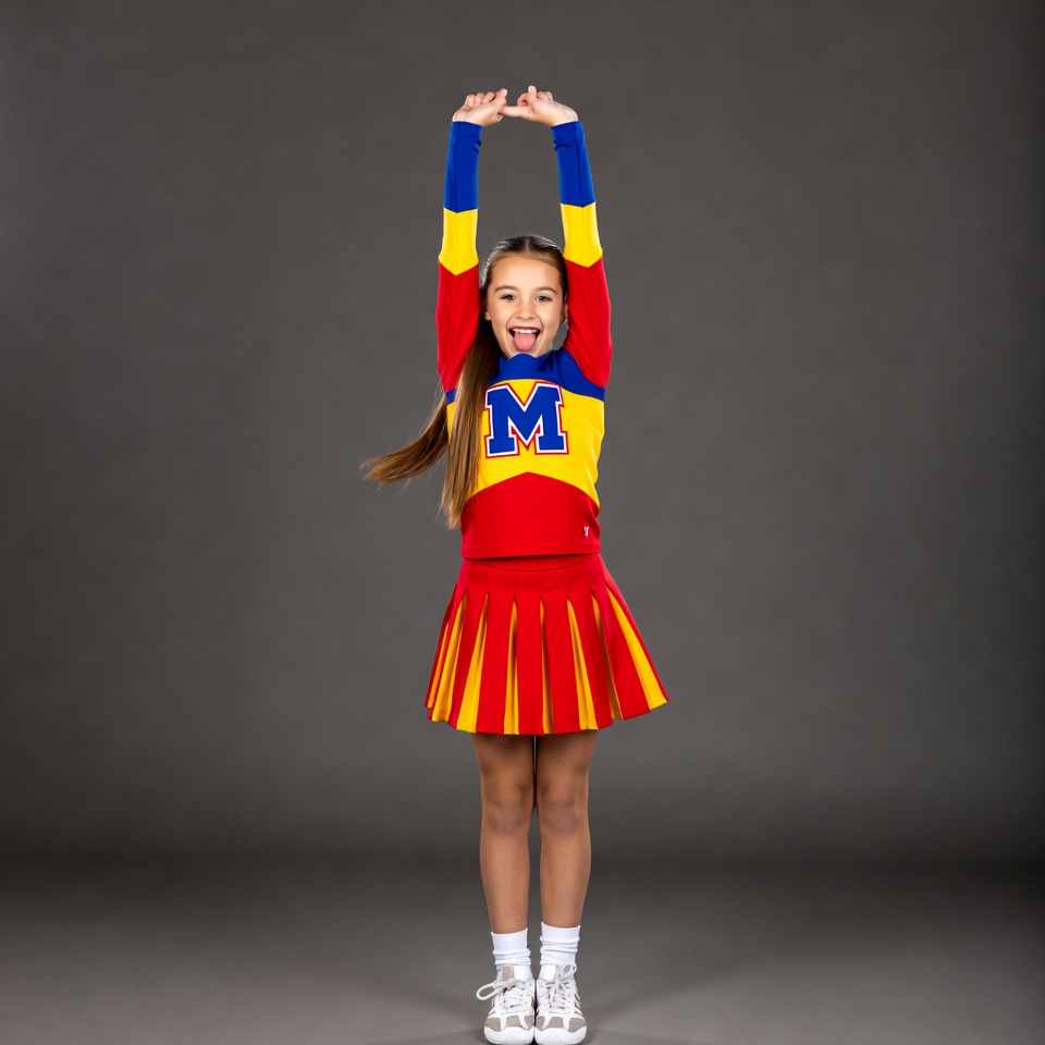 A young girl in a multicolored cheerleader uniform with a large 'M' on the chest stands on a gray background. She has long brown hair flowing behind her and raises both arms overhead with fingers extended. She wears a red and yellow pleated skirt, matching long-sleeve top, white socks, and sneakers.