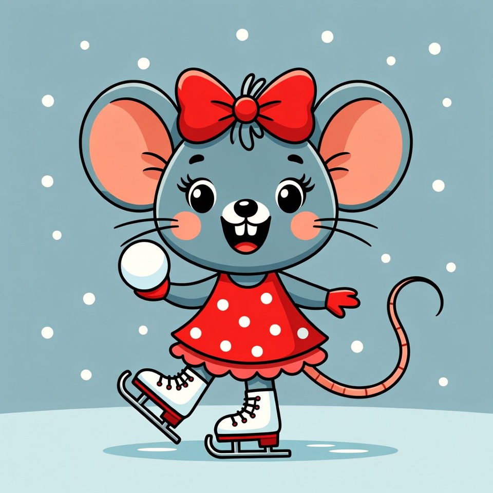 A cute cartoon gray mouse dressed as a girl wears a red polka-dot dress and skates on ice. She holds a snowball in one paw, has a big red bow on her head, and smiles happily with rosy cheeks. Snowflakes surround her on a light blue background.