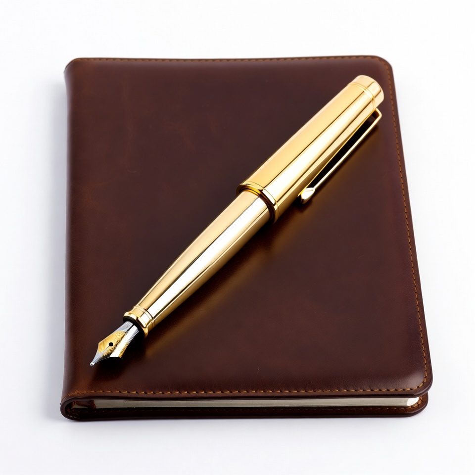 A luxurious brown leather notebook lies open on a white background. A shiny gold fountain pen rests diagonally across the notebook's cover. The pen features a sleek metal body and fine nib.