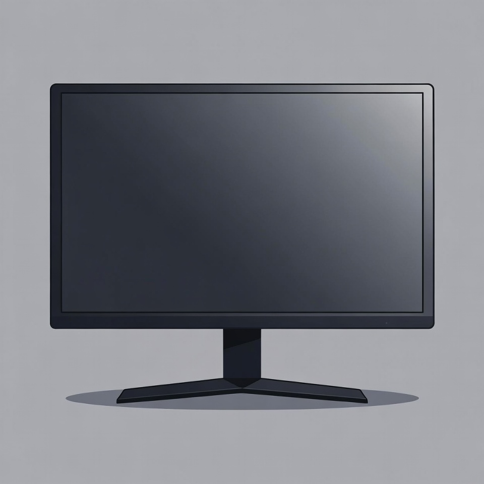 A simple vector illustration of a black flat-screen computer monitor on a gray background. The screen is blank and dark, with a sleek stand supporting the display. It features clean lines and a subtle drop shadow.