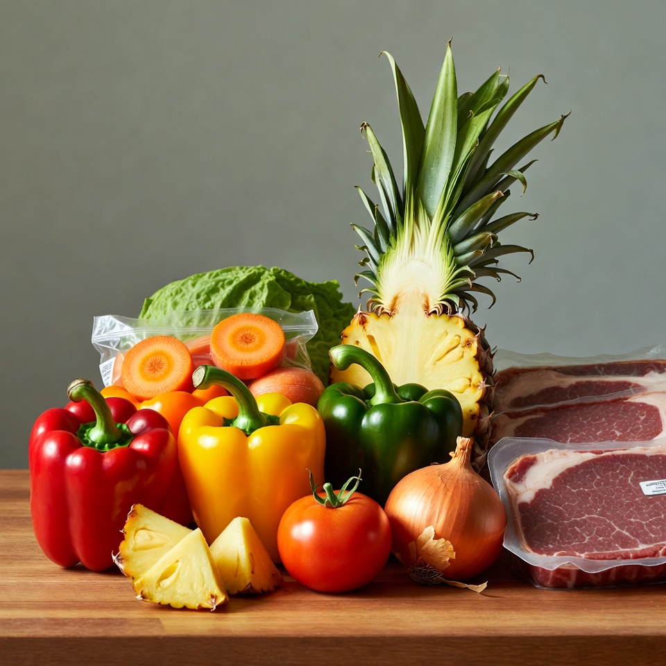 A wooden table displays a vibrant assortment of fresh produce including red, yellow, and green bell peppers, orange carrots, lettuce in plastic wrap, onions, and tomatoes. Sliced pineapple chunks and a whole pineapple with green top are prominently featured. Packages of raw red meat are placed alongside the vegetables.