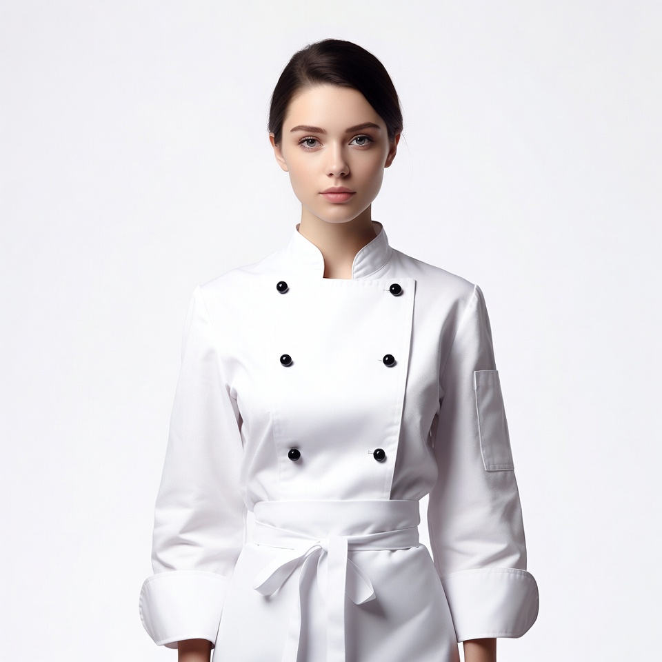 A young woman with dark hair pulled back stands confidently wearing a traditional white chef's jacket with black buttons and a waist tie. She poses directly facing the camera against a plain white background. The uniform features long sleeves and a collared neckline.