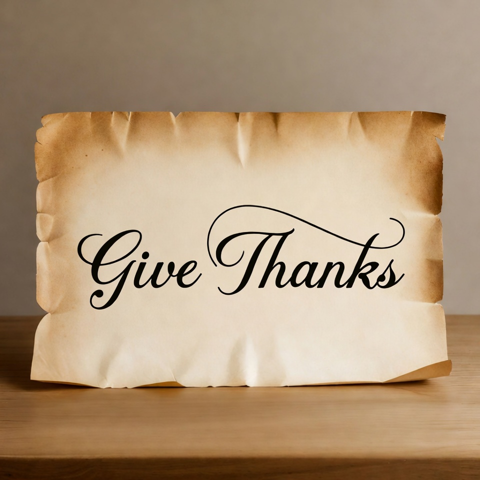 A vintage-style parchment scroll with aged, torn edges displays the elegant black text 'Give Thanks'. The scroll rests on a wooden table against a neutral gray background. The typography features cursive flourishes for a classic, Thanksgiving-inspired look.