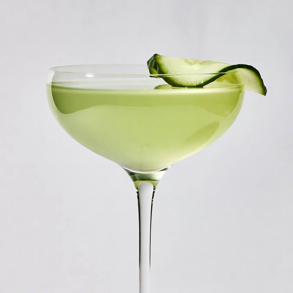 alcohol, bar drink, beverage, coupe glass, cucumber garnish, cucumber slice, garnished cocktail, green drink, isolated background, lime green, martini, refreshing drink, stem glass, cocktail