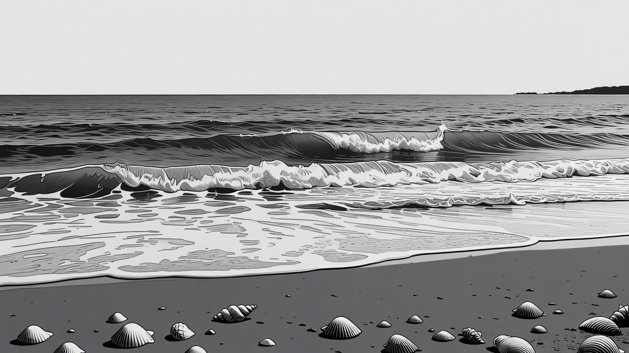 Black and white illustration of waves crashing onto a sandy beach covered with seashells. The ocean extends to a distant rocky shoreline under a cloudy sky. Scattered shells and pebbles line the wet foreground sand.