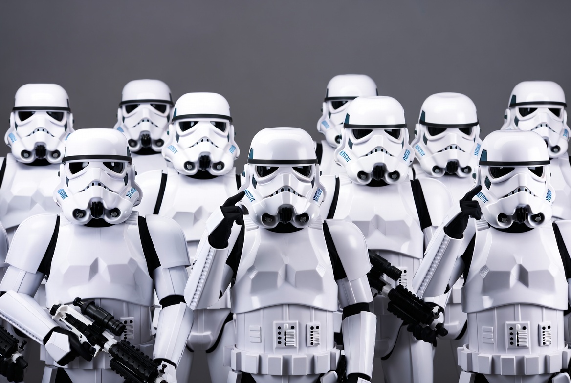 A large group of white-armored Stormtroopers from Star Wars stands in formation on a gray background. They wear iconic helmets with black visors and carry blaster rifles. Several pose with hands raised or on hips, arranged in multiple rows.