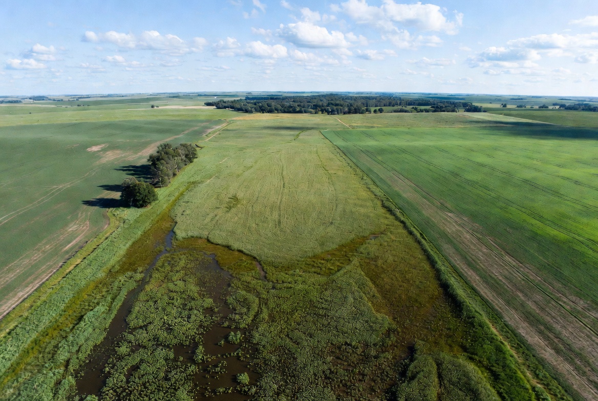 agriculture, blue sky, clouds, countryside, drone photo, expansive fields, farmland, fields, green fields, landscape, lush green, marsh, nature, partly cloudy, prairie, reeds, rural landscape, sky, trees, vegetation, water, wetland, aerial view
