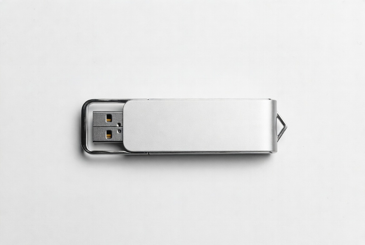 A sleek silver USB flash drive lies flat on a white background. It features a metallic body with a flip-up USB connector and a keychain hole. The drive has a blank white label on top.