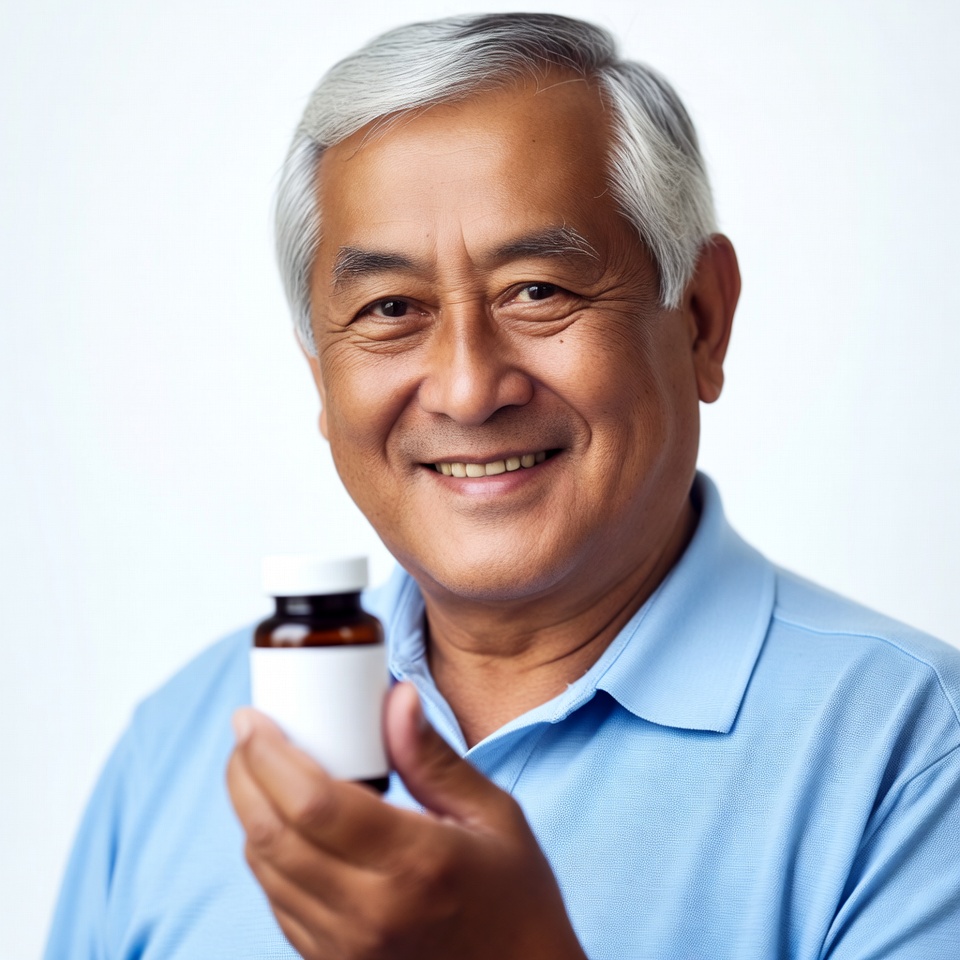 A smiling elderly Asian man with silver hair holds up a small white-capped brown pill bottle in his hand. He wears a light blue collared shirt and stands against a plain white background. His expression is friendly and direct toward the camera.
