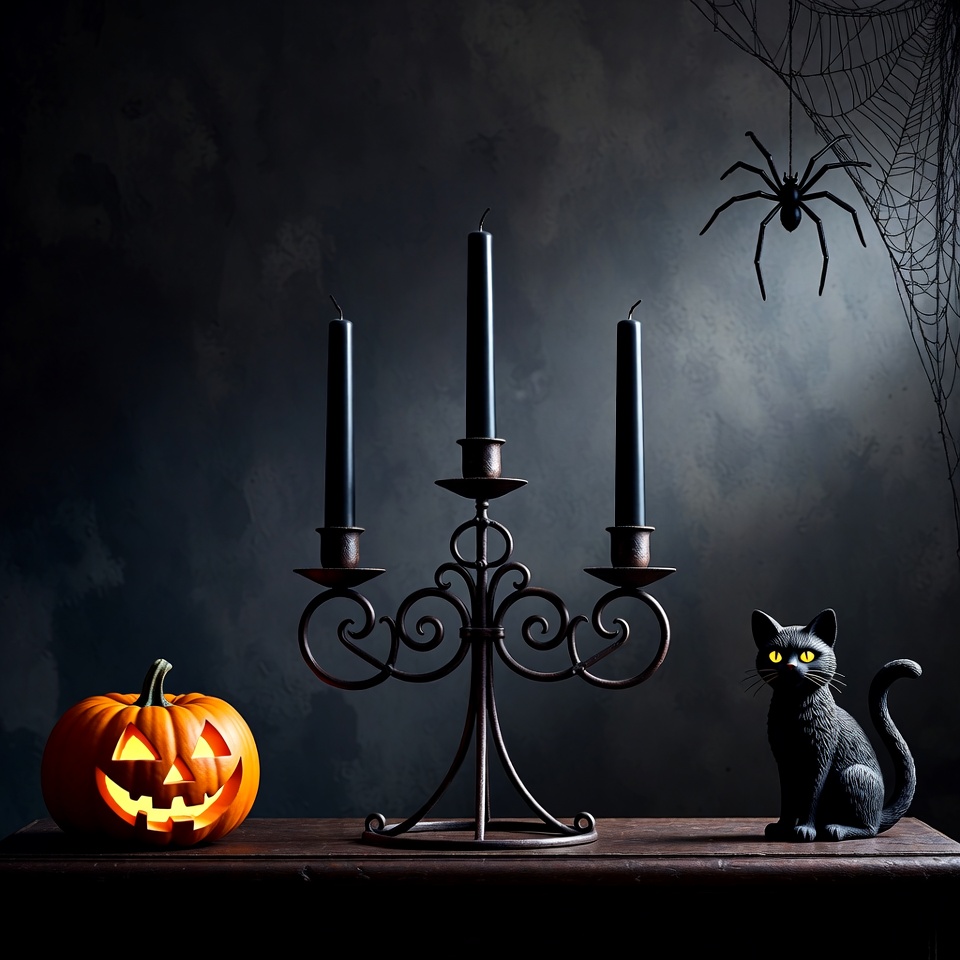 A carved jack-o-lantern pumpkin with glowing eyes sits on a wooden table beside an ornate black iron candelabra holding three lit black candles. A black cat with yellow eyes perches next to them. The scene is set against a dark wall adorned with spider webs and a large spider.