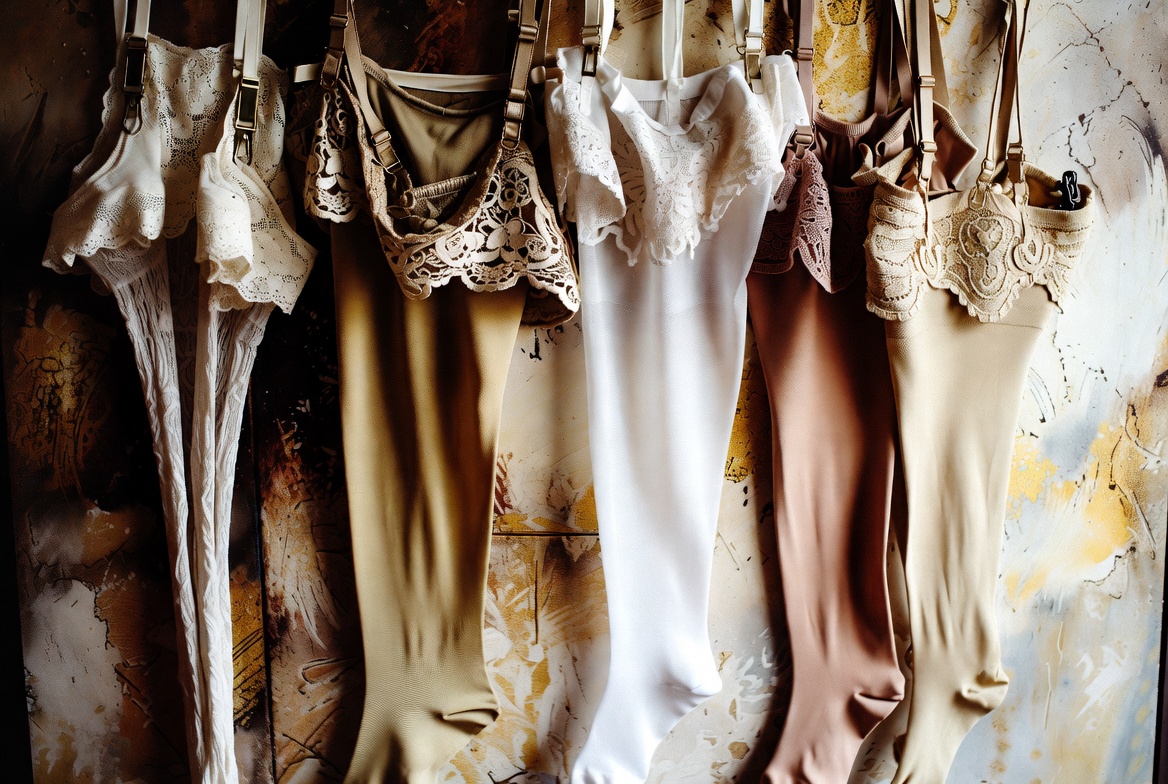 Several pairs of women's bras and stockings in white, beige, and nude tones hang from hooks against a textured yellowish background. The lingerie features lace details and straps, displayed in a row. They appear neatly arranged for viewing.