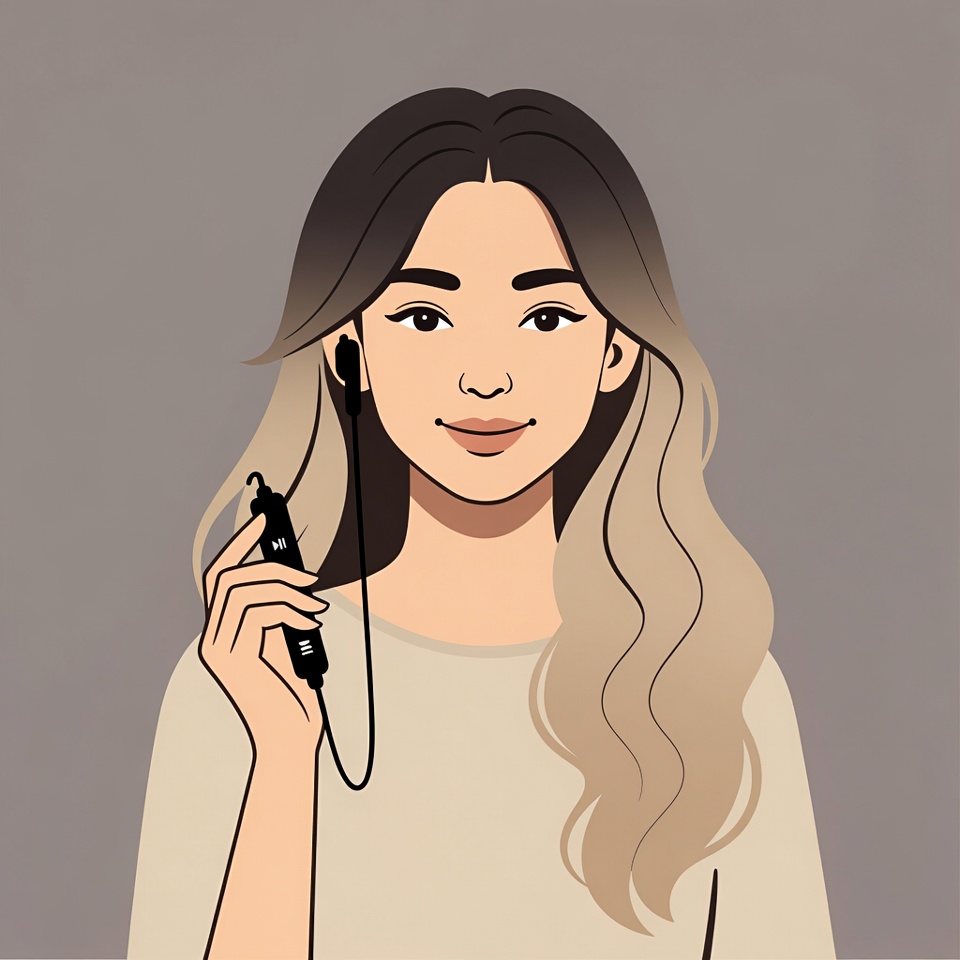An illustrated Asian woman with long balayage hair smiles while holding black wireless earbuds near her ear. She wears a light-colored top and stands against a plain gray background. Her expression is friendly and relaxed.