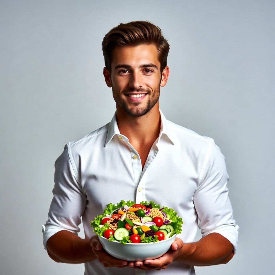 A handsome man with short brown hair and a beard smiles while holding a large white bowl of fresh salad. The salad contains lettuce, tomatoes, cucumbers, carrots, and other colorful vegetables. He wears a white button-up shirt and stands against a plain gray background.