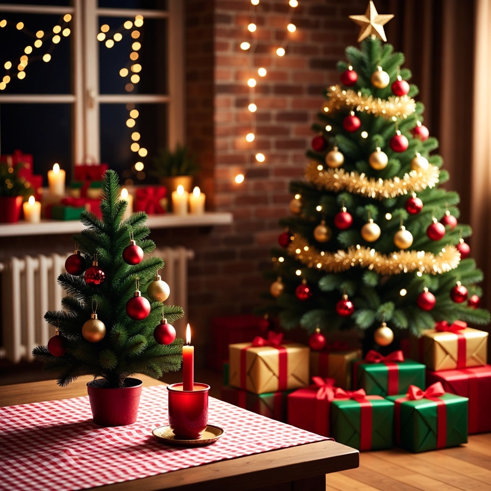 Christmas decor, Christmas lights, brick wall, checkered tablecloth, festive decoration, garland, gift boxes, holiday scene, living room, night scene, ornaments, potted tree, red candle, warm lighting, window view, wooden table, wrapped presents, Christmas tree