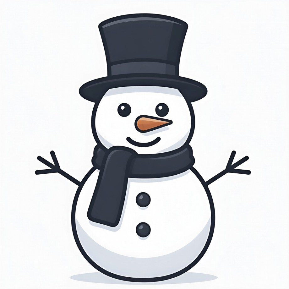 A cute cartoon snowman stands on a white background with a black top hat and matching scarf. It has a smiling face with black eyes, orange carrot nose, and three black buttons on its round body. The snowman spreads its stick arms outward in a friendly pose.