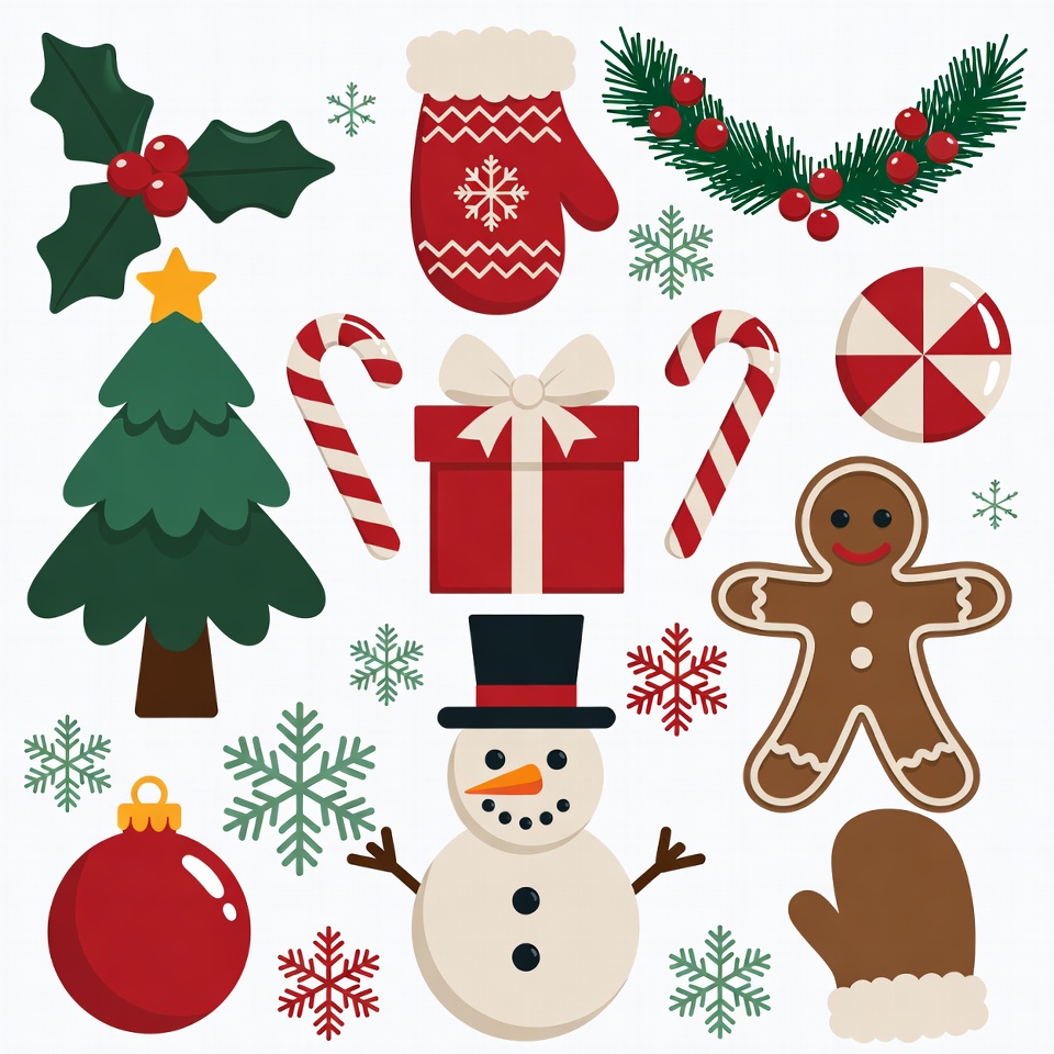 A vibrant collection of flat clipart icons features Christmas elements on a white background. Items include a snowman, green Christmas tree, red-wrapped gift, candy canes, gingerbread man, mittens, holly branches, ornaments, and snowflakes. All graphics are colorful and isolated for easy use.