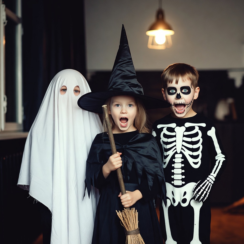 Three young children pose excitedly in Halloween costumes inside a dimly lit room. A girl wears a black witch dress with hat and broomstick, another child is dressed as a white ghost with cutout eyes, and a boy sports skeleton face paint and bones on black clothing. A hanging lamp illuminates the group against a dark background.