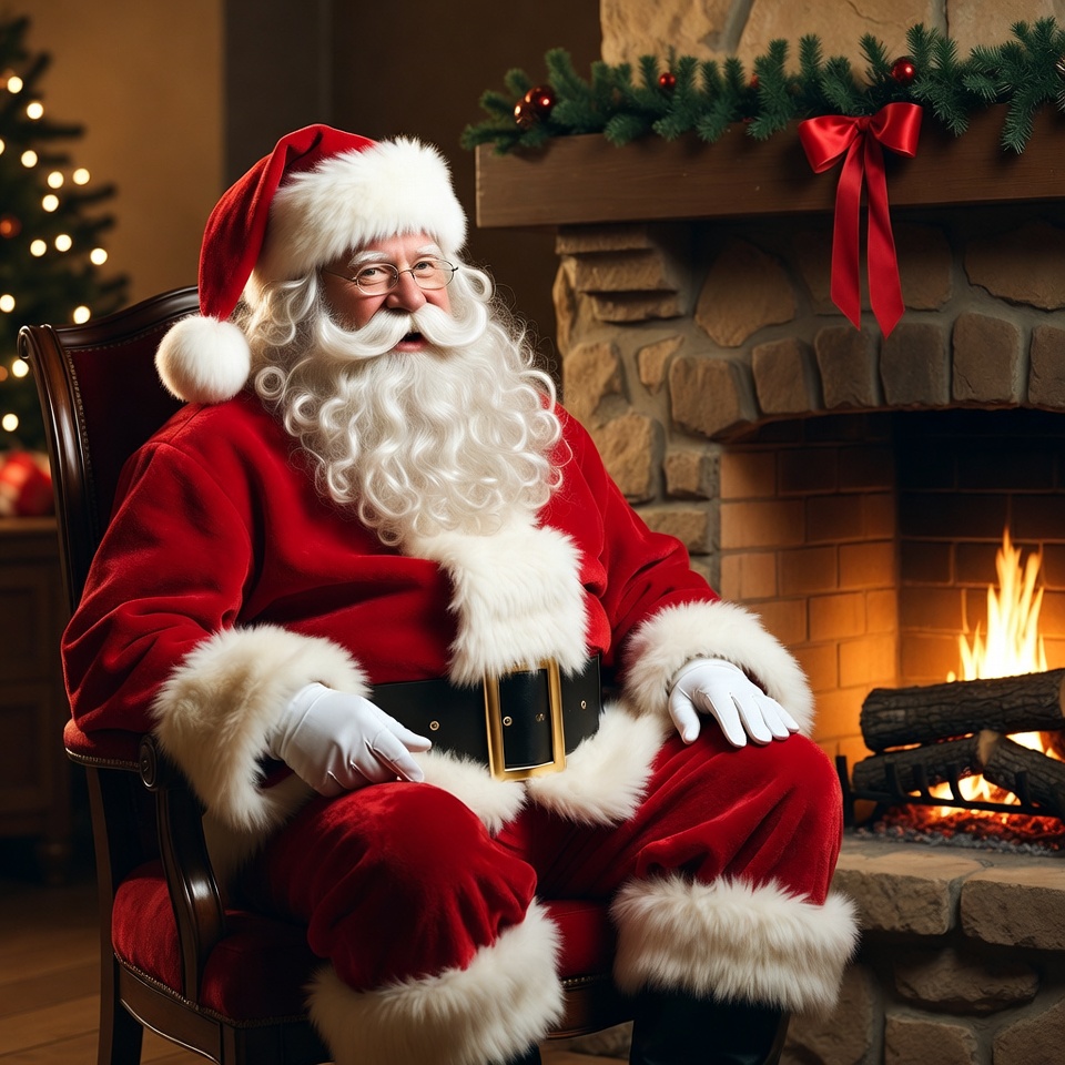 Santa Claus with a long white beard and red suit trimmed in white fur sits in a wooden armchair by a stone fireplace with burning logs. He wears a red hat with white pom-pom and black boots, smiling warmly. Christmas decorations including a garland, stockings, and a lit tree are visible in the cozy room.