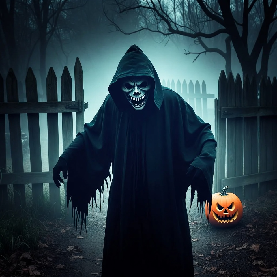 A cloaked grim reaper figure with a skeletal face stands menacingly in a dark foggy forest near a wooden fence. A carved jack-o-lantern pumpkin sits on the ground beside a dirt path lined with fallen leaves. Twisted bare trees and mist create an eerie Halloween atmosphere.