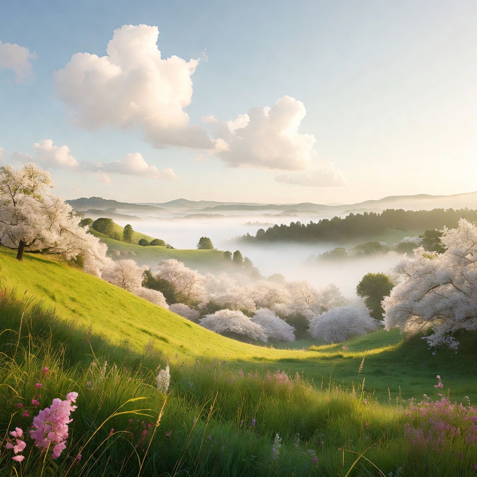 A scenic valley landscape features blooming cherry blossom trees covering rolling green hills. Thick mist fills the lower areas between the hills, with soft sunlight illuminating fluffy white clouds in the bright blue sky. Pink wildflowers dot the lush green grass in the foreground.