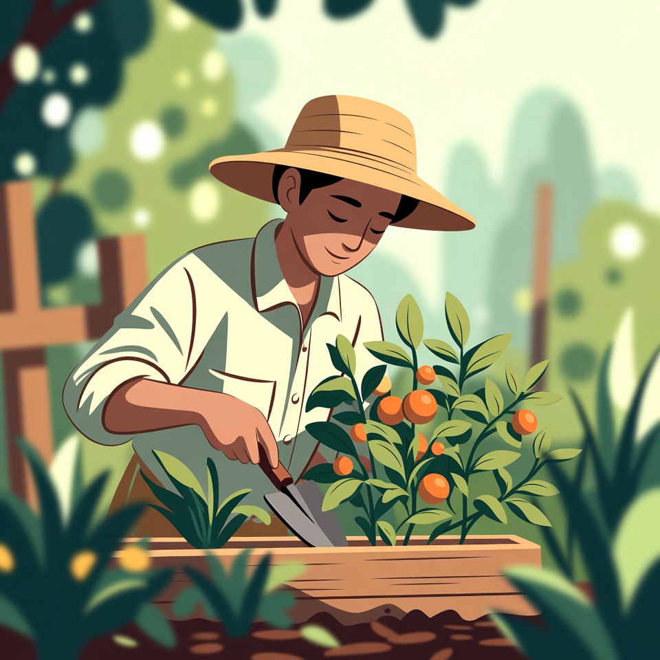 An illustration depicts an Asian man wearing a straw hat and white shirt, carefully harvesting small oranges from a bush in a wooden planter. He uses pruning shears amidst lush green foliage and plants in a vibrant garden setting with trees and a fence in the background. The scene features a colorful, hand-drawn style with glowing highlights.