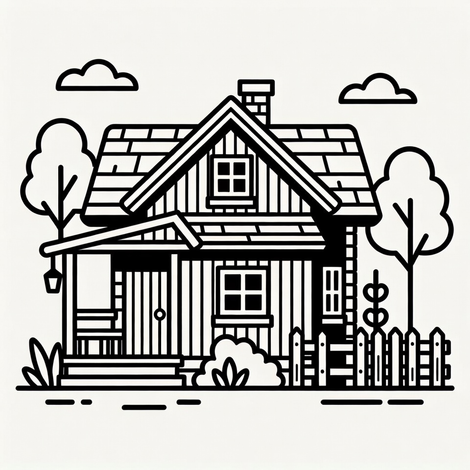 A black line drawing depicts a cozy wooden cottage with a sloped roof, chimney, and front porch. Flanking trees, bushes, a picket fence, and fluffy clouds surround the house on an isolated white background. Windows and a lantern add detail to the simple illustration.