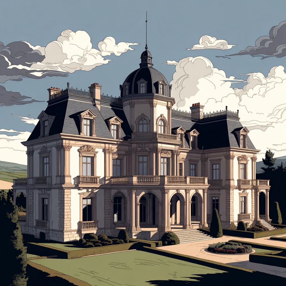 A detailed line art illustration depicts a large French-style chateau with dark slate roofs, multiple towers, and a central dome. The mansion features ornate stone facades, arched windows, and a grand entrance with columns and steps. It sits on a grassy hillside surrounded by manicured hedges, trees, and a partly cloudy sky.
