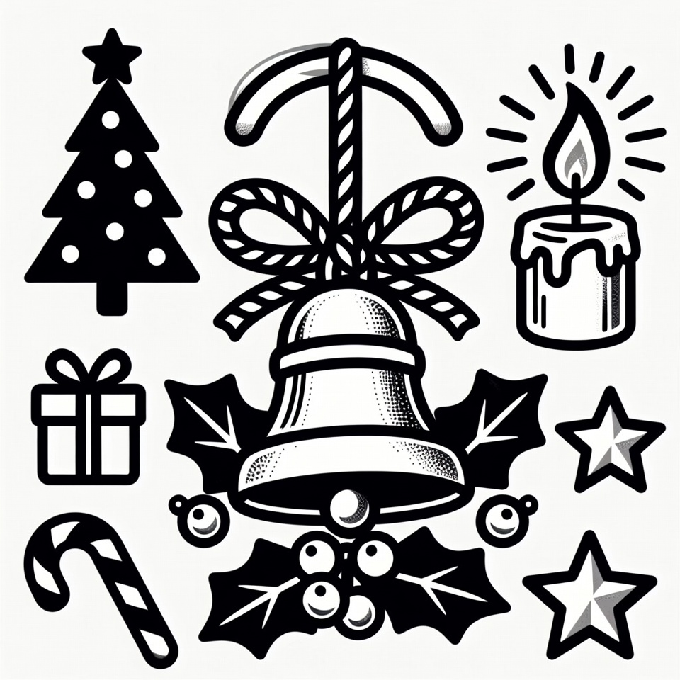 Christmas decoration, Christmas icons, Christmas tree, anchor ornament, bell, berries, black and white, candle, candy cane, festive elements, gift box, holiday symbols, holly, illustration, isolated background, line art, star, vector art, wreath elements, Christmas clipart