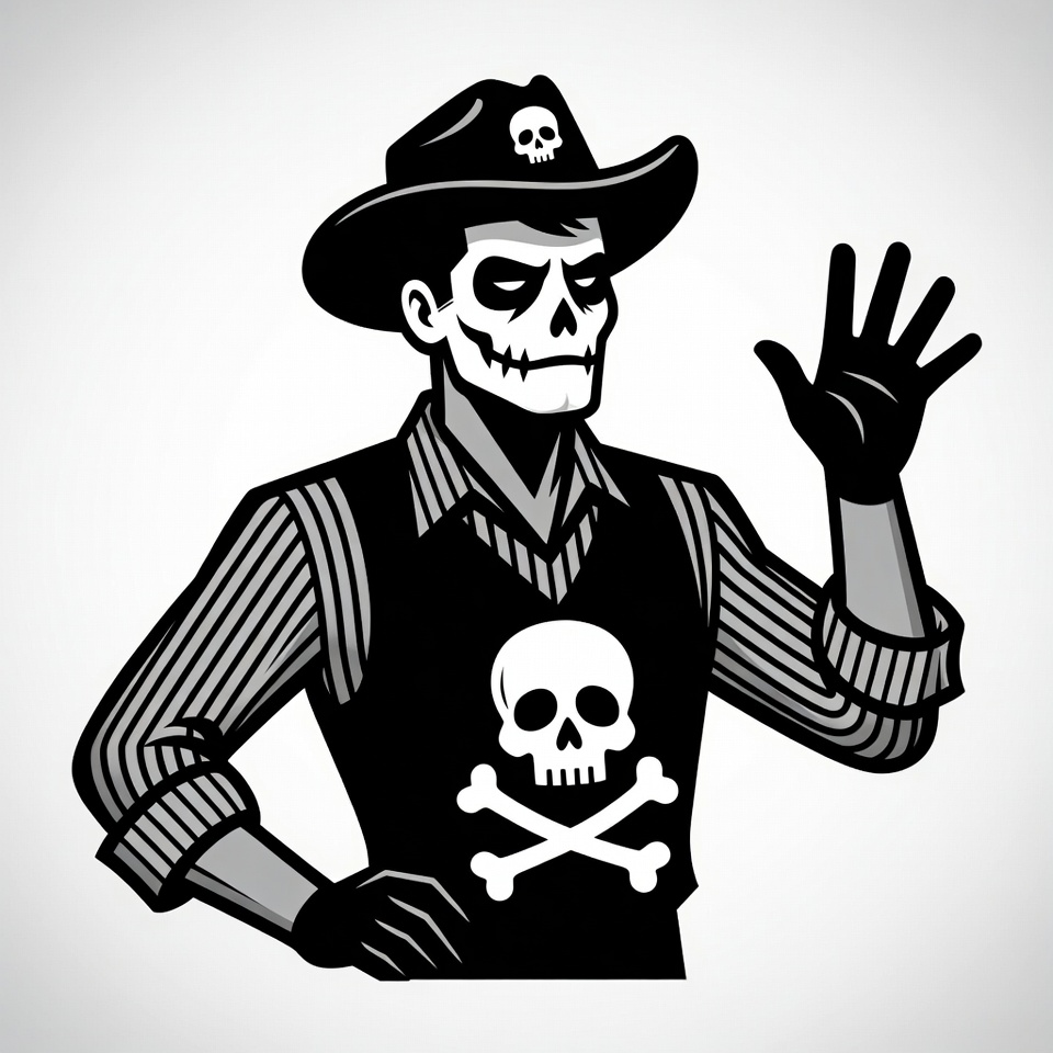 A black and white illustration of a skeleton cowboy wearing a wide-brimmed hat with skull emblem. He has a skeletal face, striped shirt, black vest with skull and crossbones, and black gloves. He waves with one hand raised while posing confidently on an isolated white background.